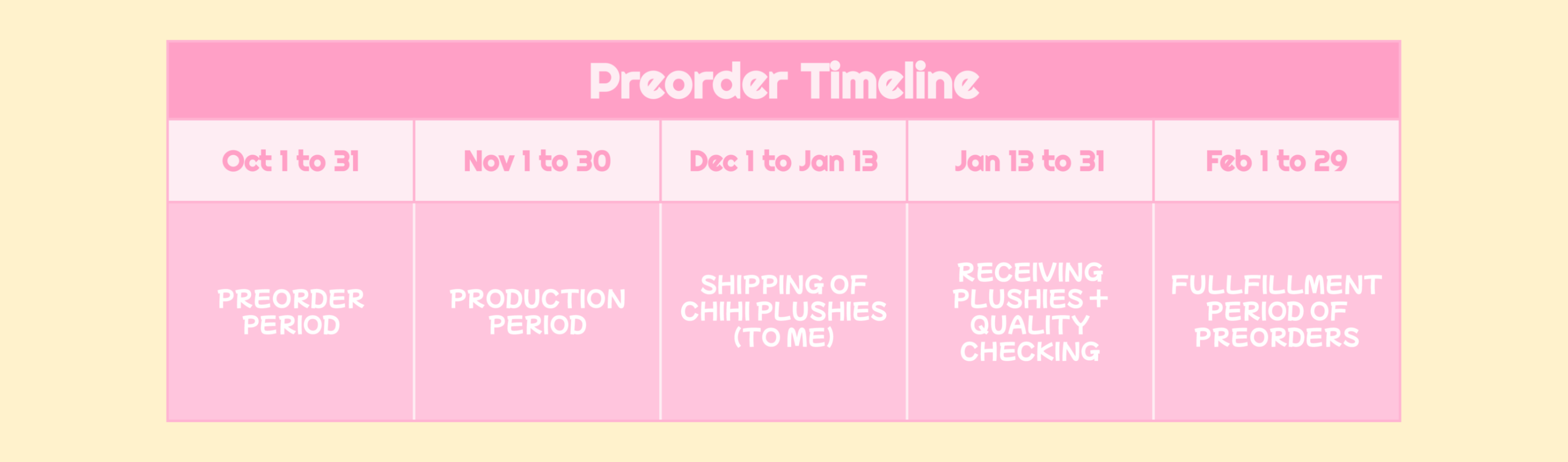 UPDATE: Chichi plushies are currently in production, but preorders period has been extended until November 10 ! This doesn’t affect the overall timeline, just wanted to give more time for people to adopt Chichi !