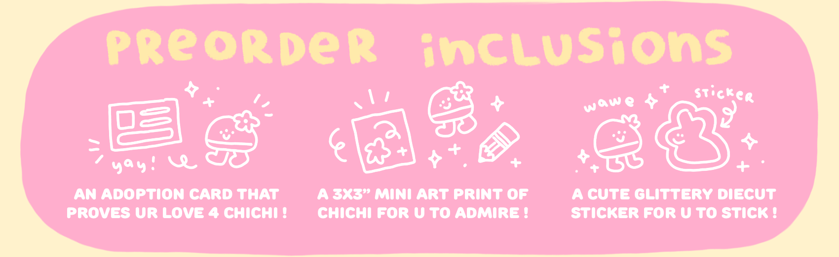 Chichi also comes with free goodies and super cute packaging ! These preorder inclusions may not be included in Chichi adoptions after the preorder campaign ends.